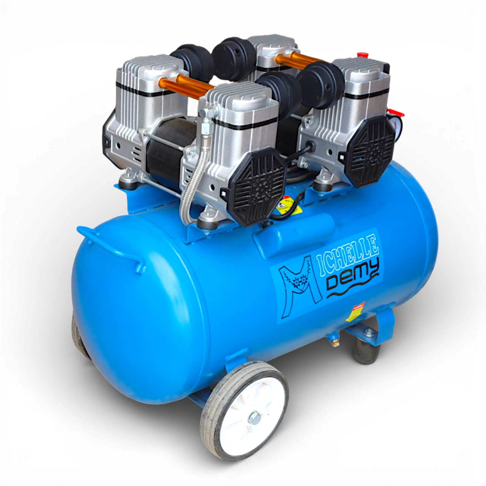 كمبروسر هواء كاتم طبي بسعة 50 لتر مزود برأسين (2 هيد) وقدرة 550 وات بملف نحاس من دمي. يوفر ضغط هواء ثابت مع مستوى ضوضاء منخفض، مما يجعله مناسبًا للأماكن التي تحتاج تشغيل هادئ مثل العيادات والورش الصغيرة. يعتمد هذا النوع على نظام تشغيل خالي من الزيت مما يقلل الصيانة ويحافظ على نظافة الهواء المضغوط.