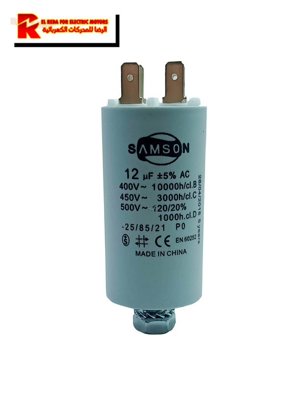 مكثف كهربائي بسعة 12 ميكروفاراد من نوع ترمل، مصمم لدعم تشغيل الموتورات الكهربائية بكفاءة عالية، خاصة في مضخات المياه، المراوح، والغسالات.