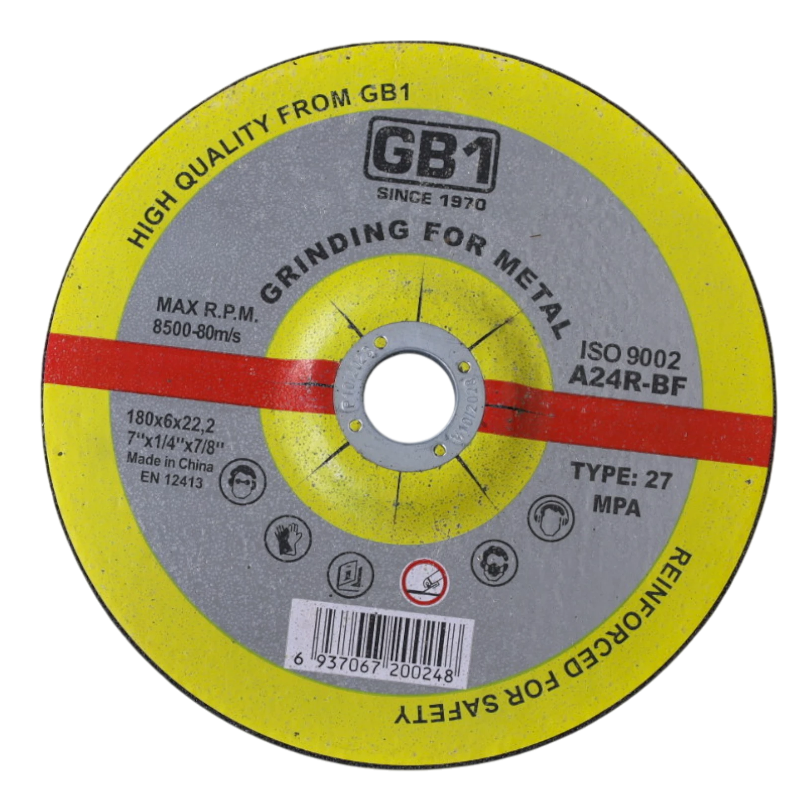 حجر جلخ مقاس 7 بوصة بسُمك 6 ملم، مصمم لتهذيب الحديد وإزالة الزوائد المعدنية. يقدم ثباتًا جيدًا أثناء التشغيل وي withstand الاحتكاك العالي، مما يجعله مناسبًا للورش وأعمال الجلخ اليومية.