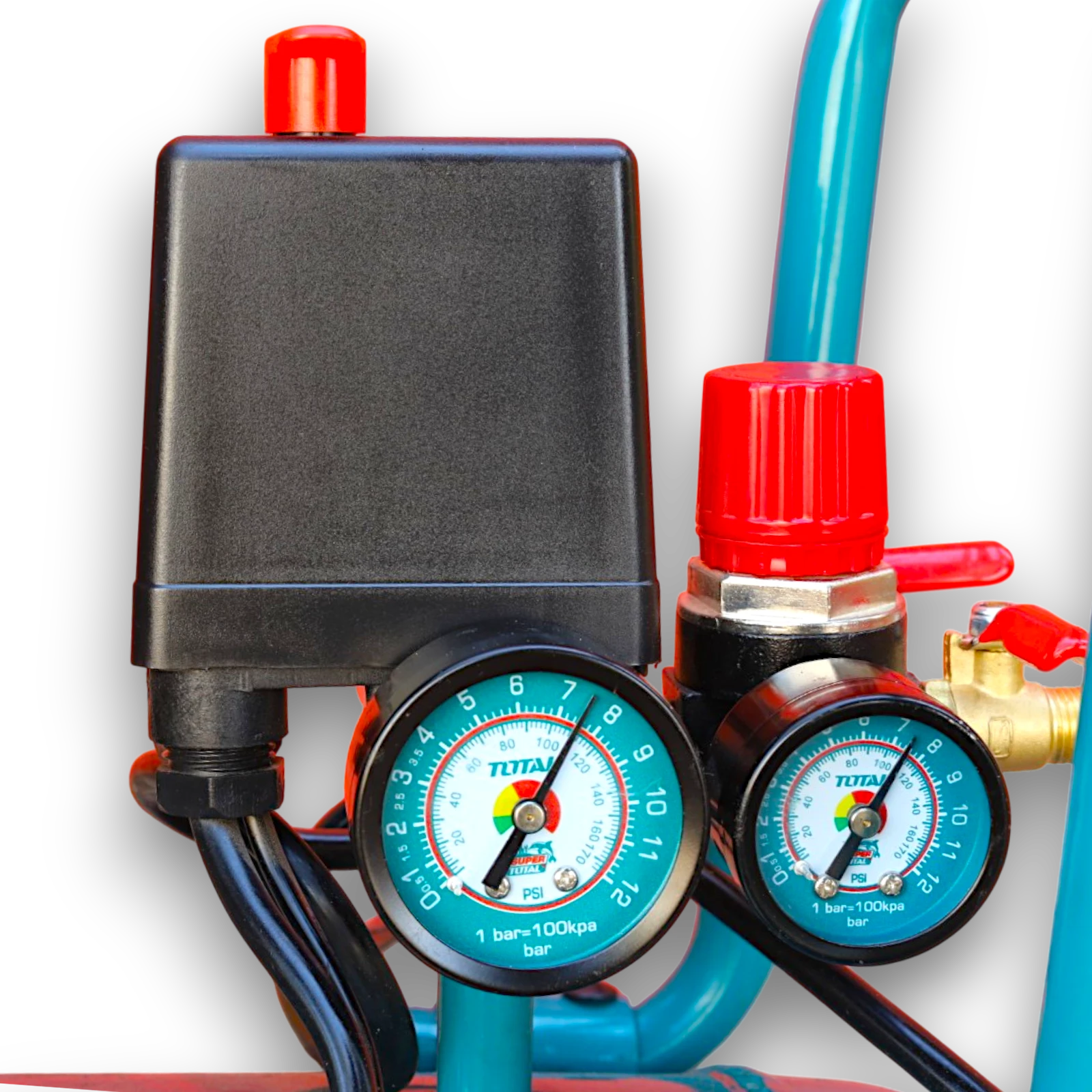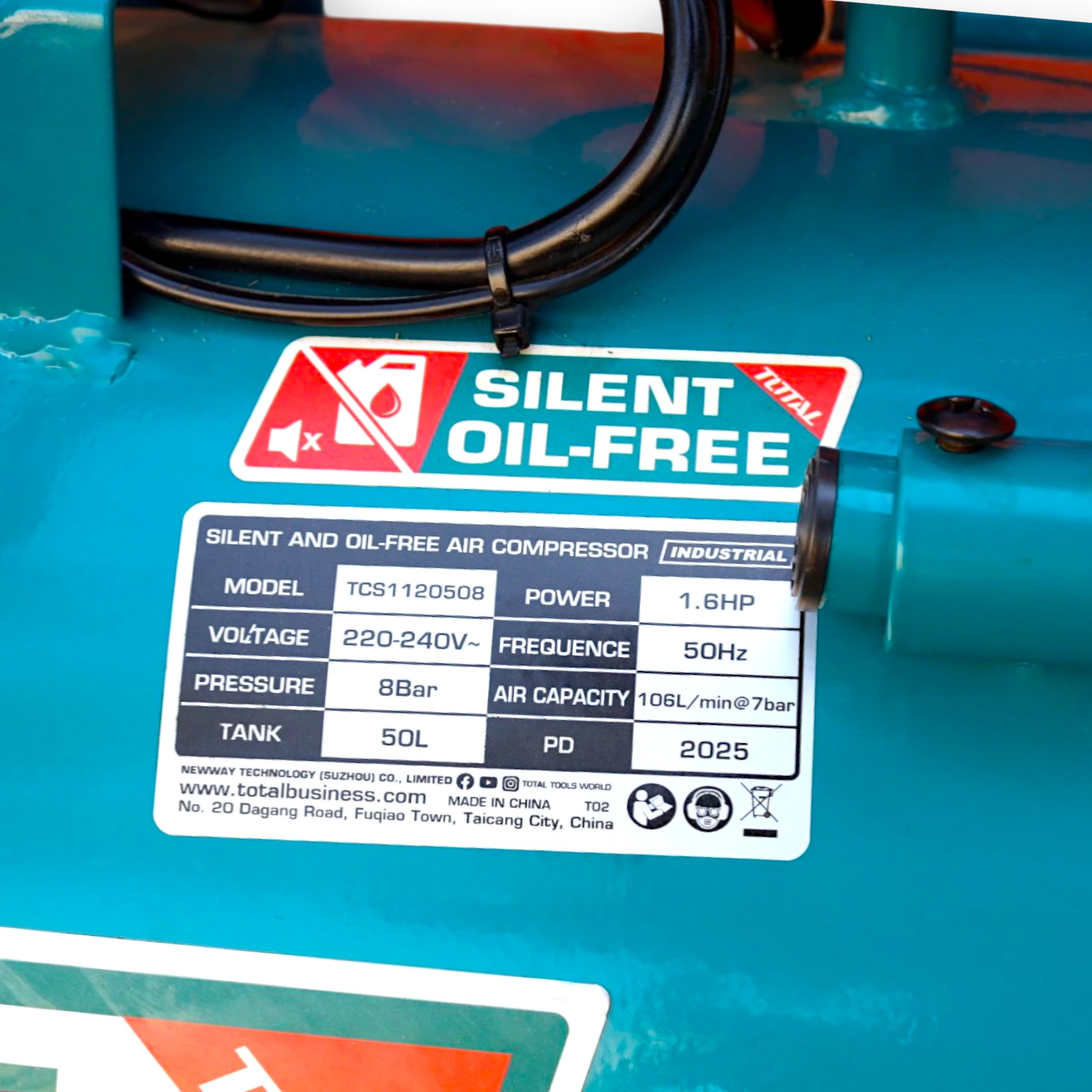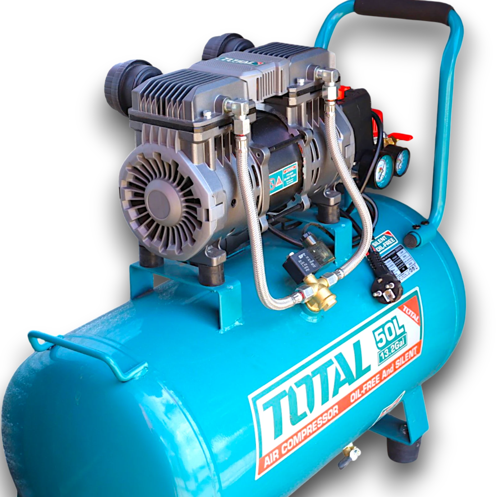 كمبروسر هواء كاتم طبي بسعة 50 لتر وقدرة 1200 وات بملف نحاس من توتل، مصمم لتوفير ضغط هواء ثابت مع مستوى ضوضاء منخفض. مناسب للاستخدام في العيادات والورش التي تحتاج إلى تشغيل هادئ وأداء مستقر.