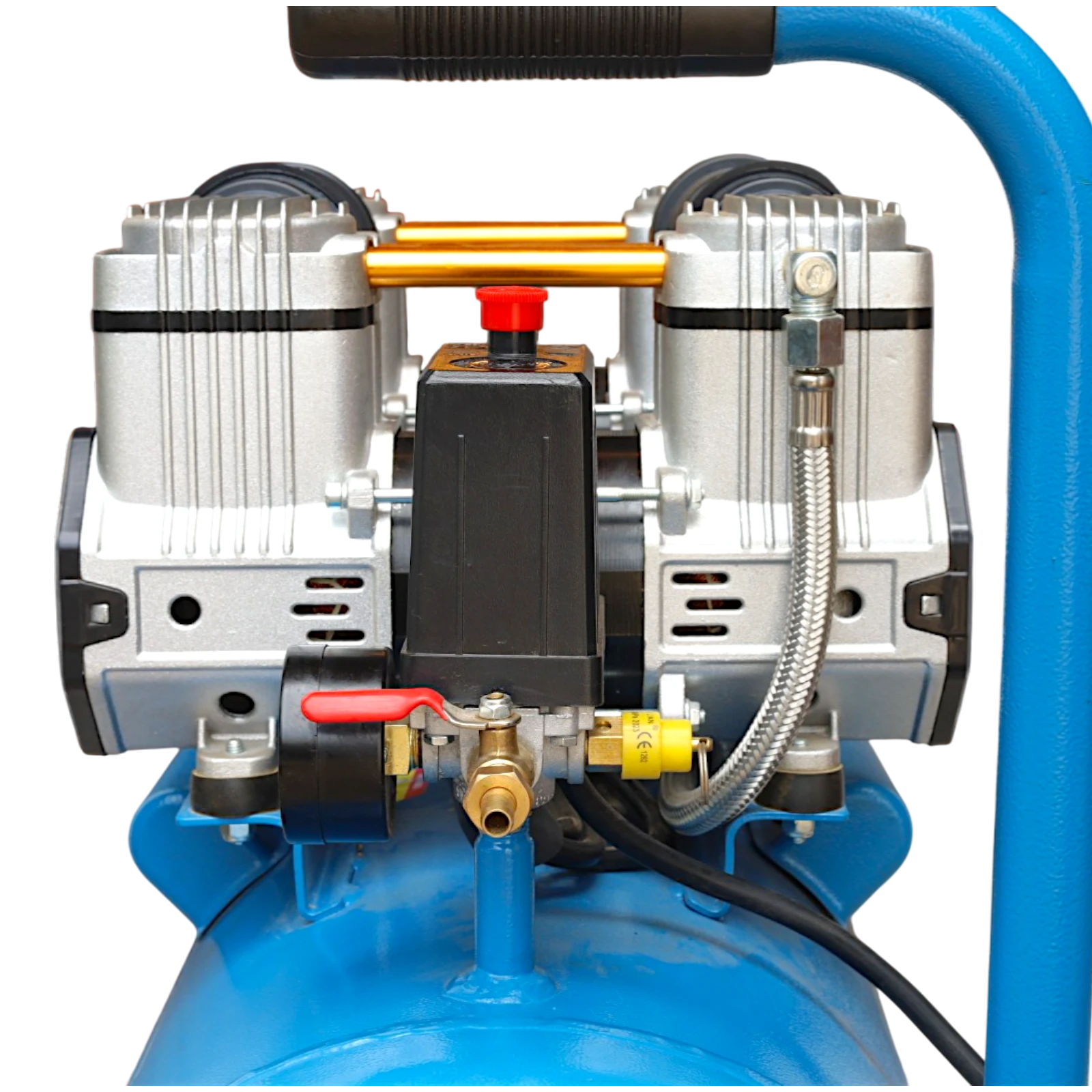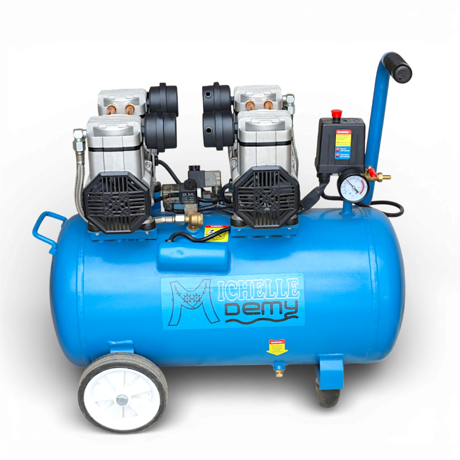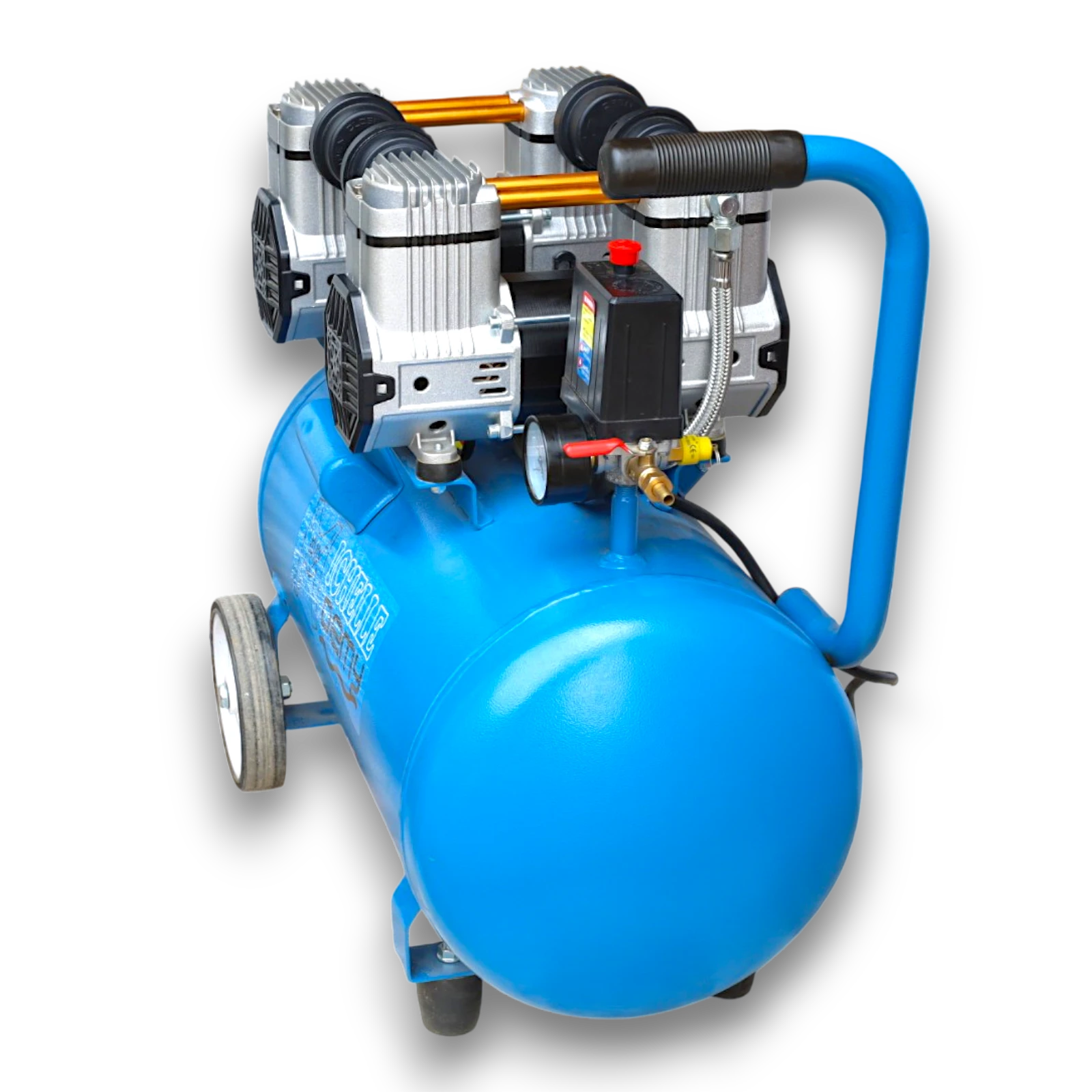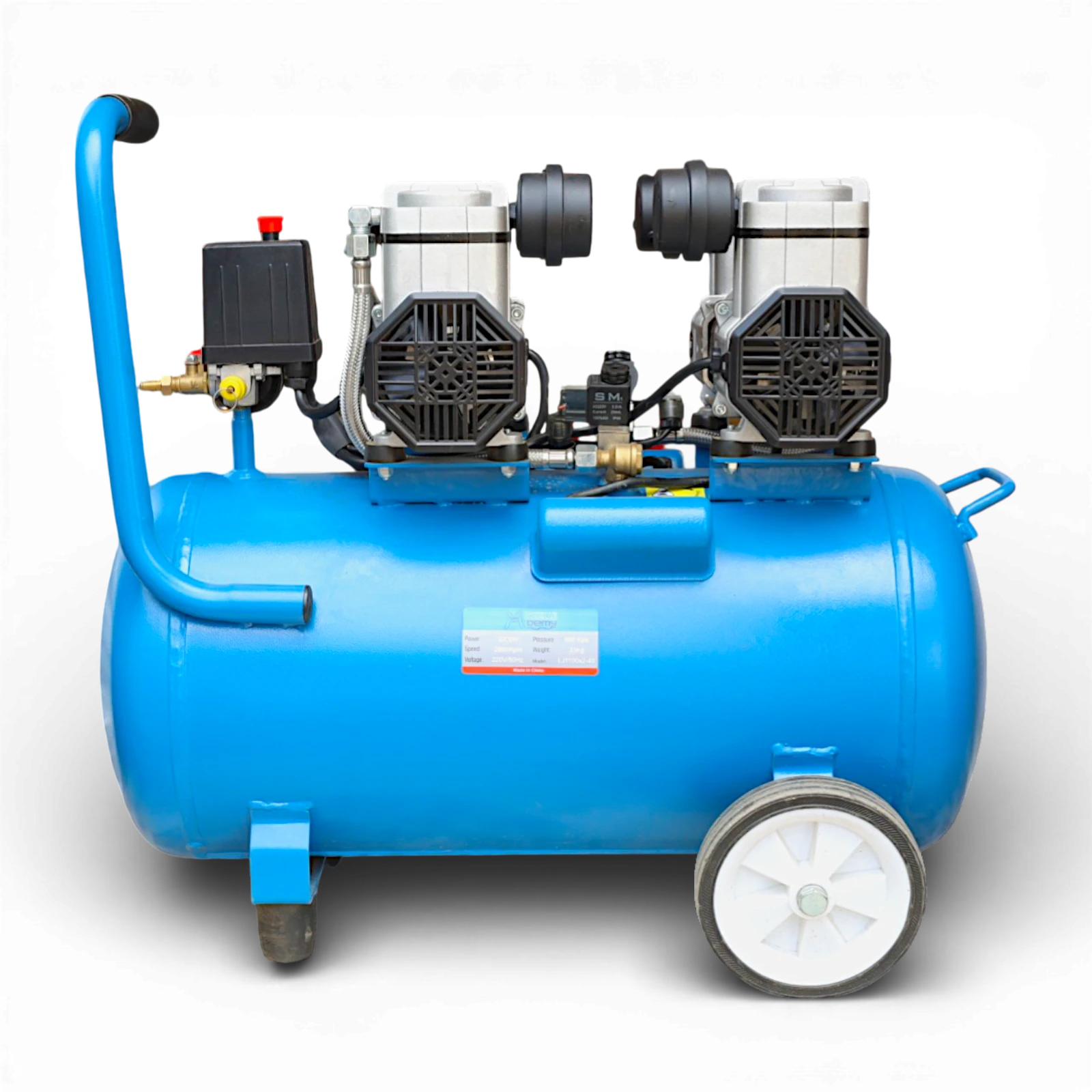 كمبروسر هواء كاتم طبي بسعة 50 لتر مزود برأسين (2 هيد) وقدرة 550 وات بملف نحاس من دمي. يوفر ضغط هواء ثابت مع مستوى ضوضاء منخفض، مما يجعله مناسبًا للأماكن التي تحتاج تشغيل هادئ مثل العيادات والورش الصغيرة. يعتمد هذا النوع على نظام تشغيل خالي من الزيت مما يقلل الصيانة ويحافظ على نظافة الهواء المضغوط.